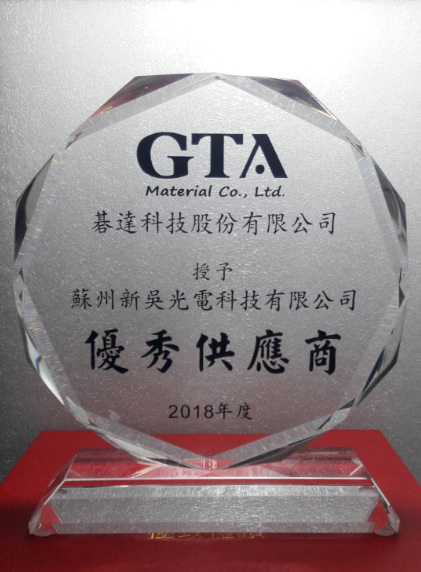 基达科技股份有限公司授予苏州新吴光电科技有限公司“2018年年度优秀供应商”称号,这个奖项是基达科技股份有限公司对新吴光电秉承一流产品质量的肯定,是对新吴光电追求一流品牌服务的肯定。