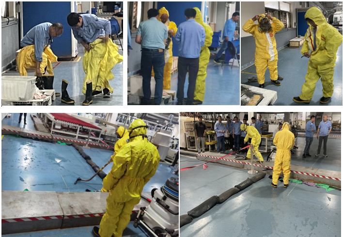 2023年危化品、危废泄漏演习报告 通过演习提高组织在危化品、危废泄漏时的反应和组织抢救能力,提高员工环保、安全意识。根据计划安排,2023年8月30日 08:30 组织一次专项应急演习。在公司领导高度重视下和各部门的积极参与下,演习达到了预期目的,证明化学品、危废泄漏应急预案有效,但也存在一些不足之处。 一、演习过程: A、演习准备。为搞好演习、制定演习计划,具体分工,准备了演习中所需的防护用品及演习物资,为演习顺利实施奠定了良好的基础; B、本次演习得到了公司领导层高度重视,,强调了演习的重要性,要求各部门密切配合,严格按照计划执行,从而使此次演习圆满完成; C、演习前对员工宣讲化学品泄漏应急知识与401化学安全技术说明书讲解; 二、存在不足: 通过这次演习,也暴露了一些不足之处。 A、防护服灰尘过多; B、沙袋数量不足,无法全方位封堵; C、收尾人员未进行防护便直接进行作业; D、应急结束后,吸尘器未清洁、冲洗; E、现场缺少应急物资——石灰。 三、改进措施: A、点检时需观察应急物资的状态,及时清洁清理; B、额外请购消防沙袋; C、加强培训,现场点评,进入作业场所必须穿戴好防护用品; D、已在现场对员工进行讲解,应急结束需妥善清洗、晾干防护用品,确认无误后方可重新收纳; E、现场应急物资加设石灰。